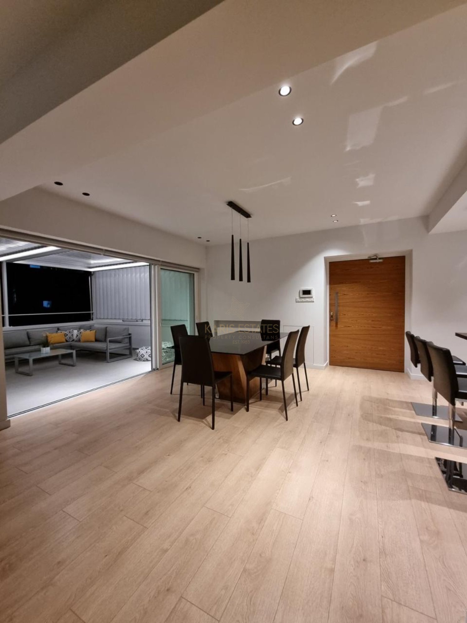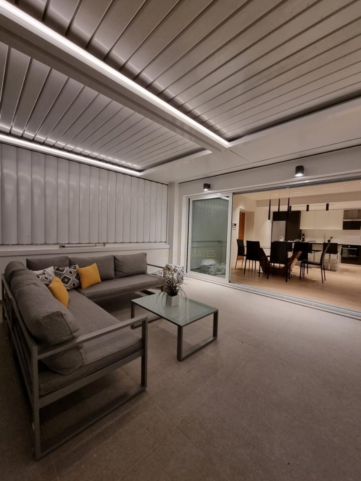 Outdoor: A large 42m² private veranda with aluminum pergola and digital lighting, perfect for outdoor living