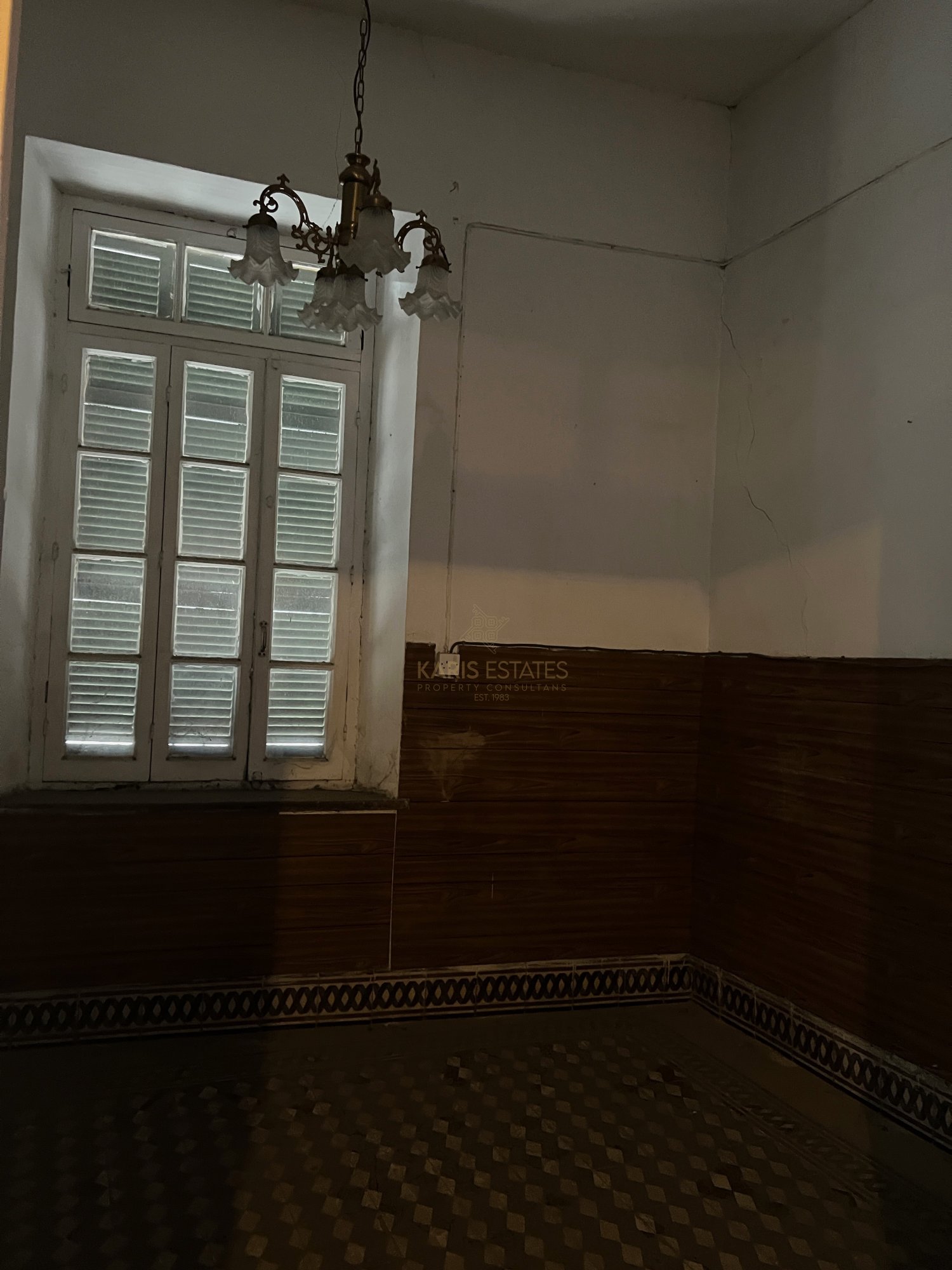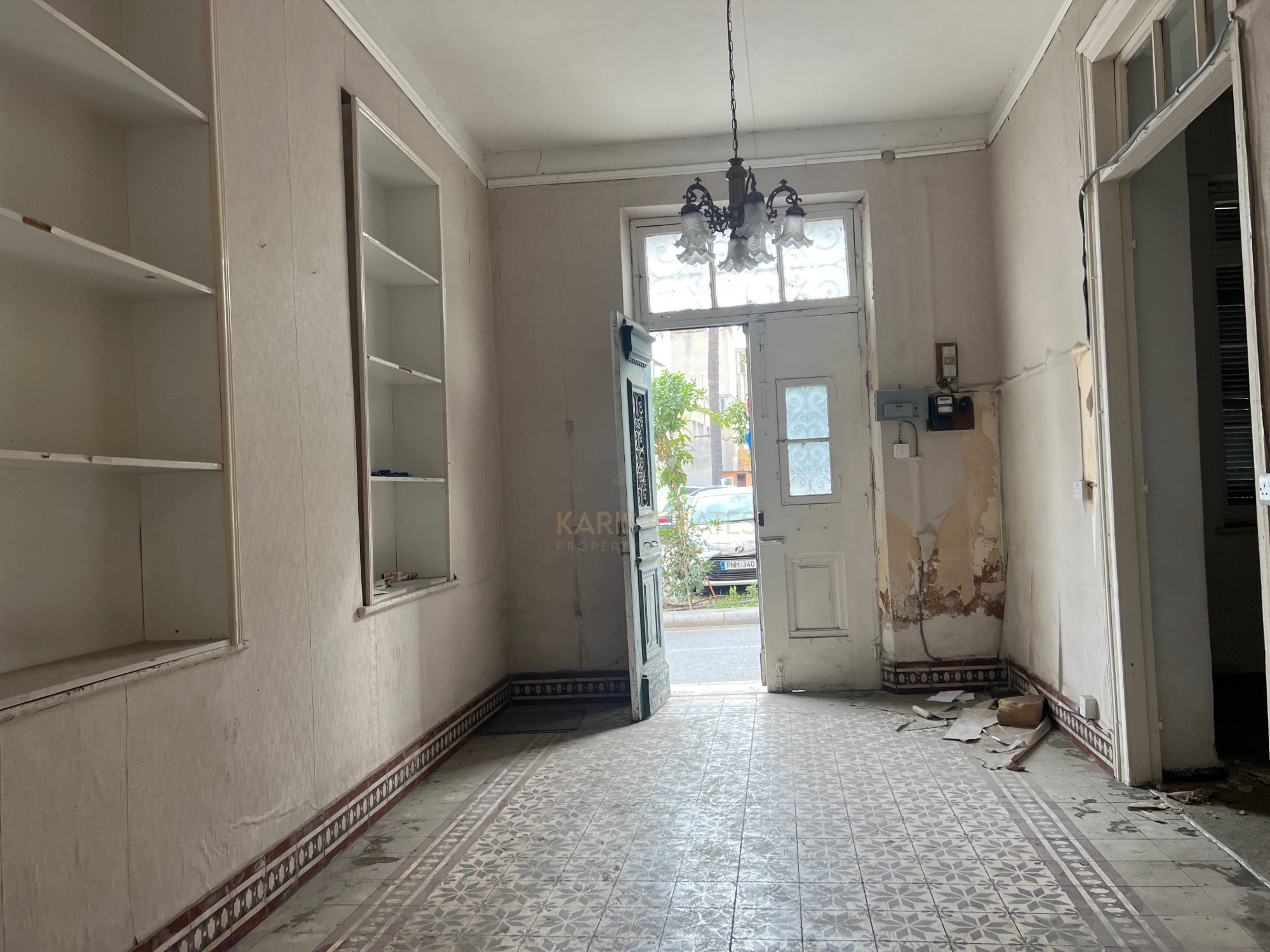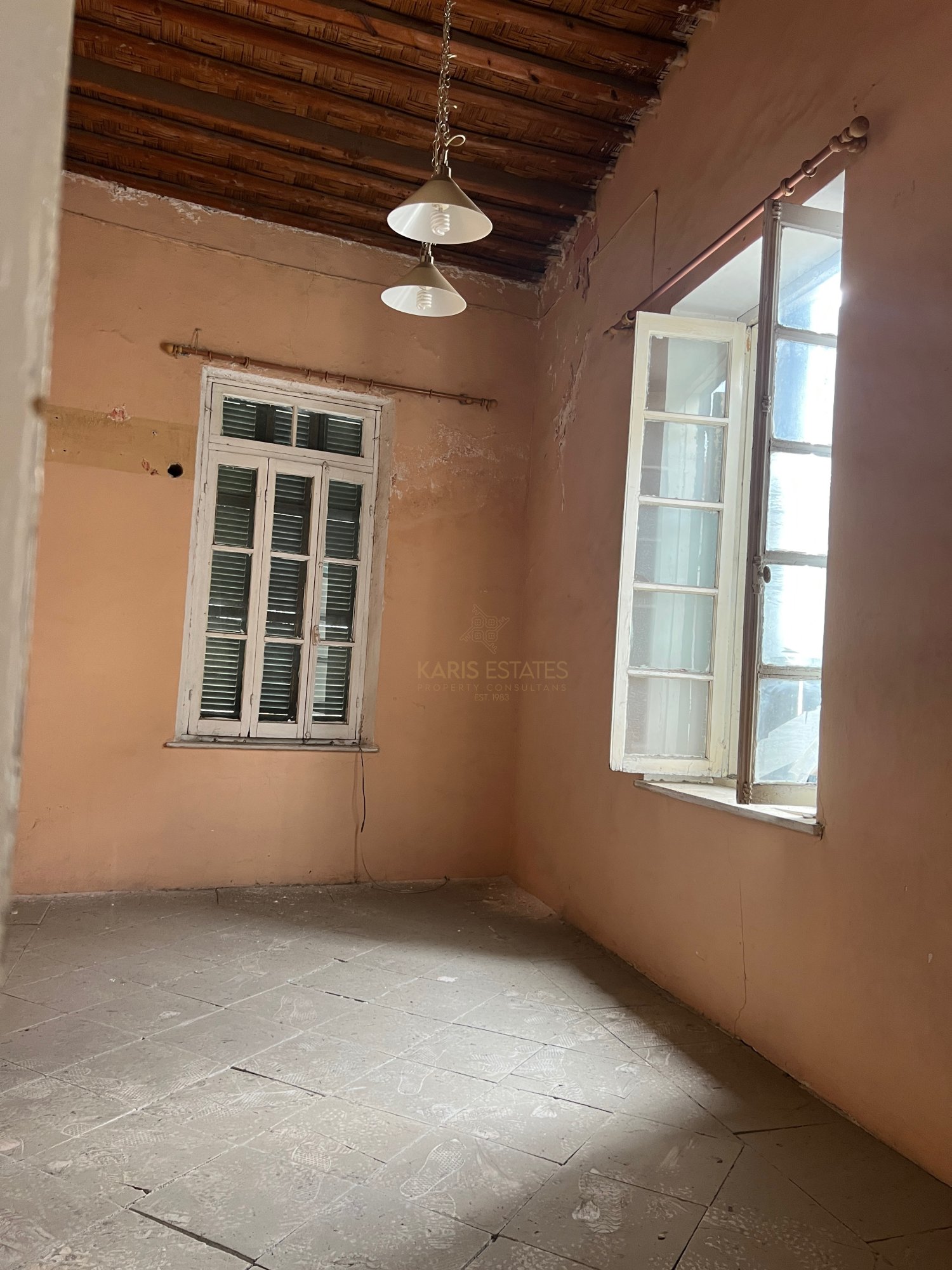 Configured into an entrance hall, what is called 'iliakos' in the traditional cypriot architecture, with the original marble tiles intact, a separated living room on the left side and a separated dining room in the rear left side of the house, and on the right of the main hall there is currently another room and a large kitchen area and a guest wc.