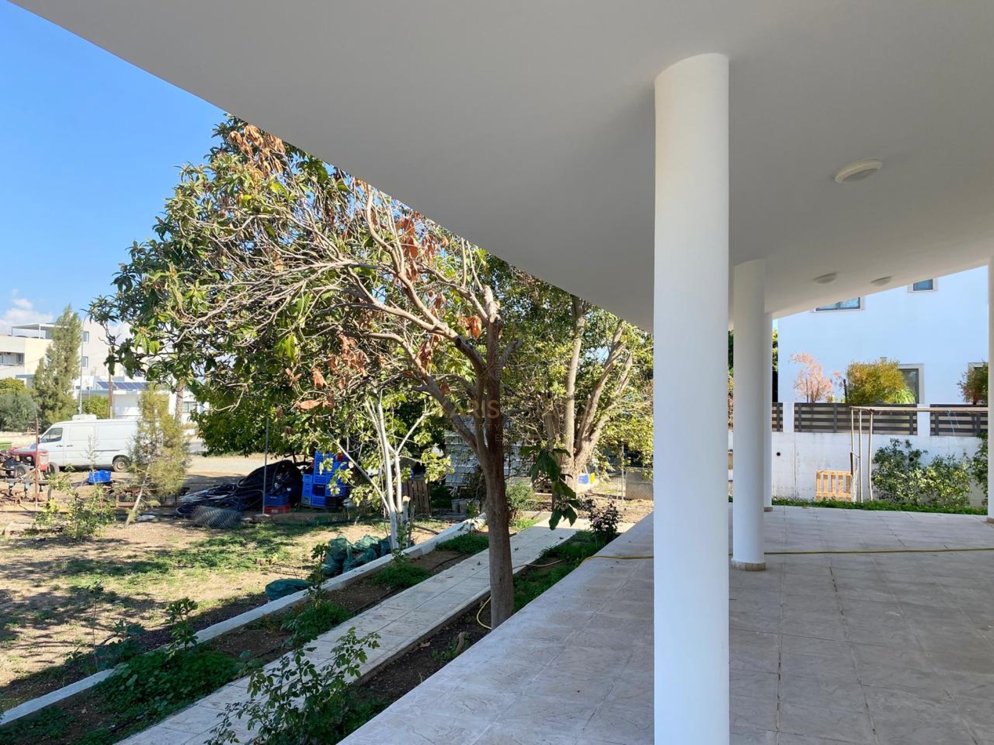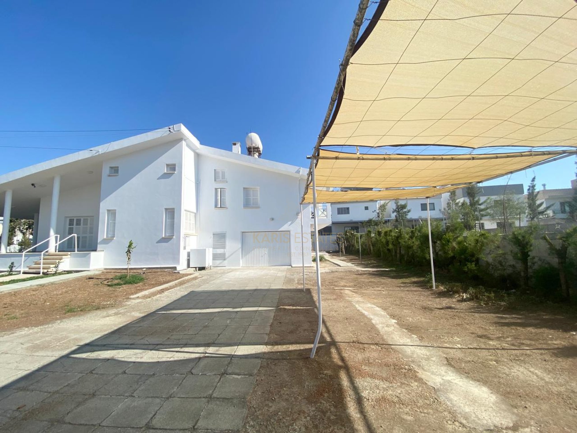 Parking: Gated garage and additional yard parking under a tent
