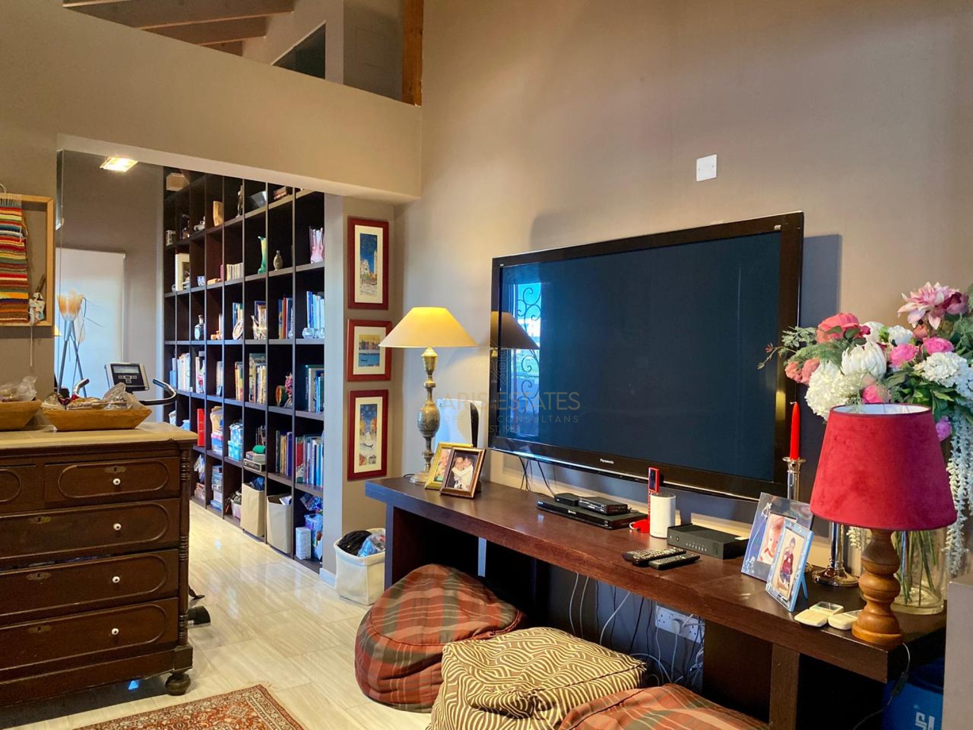 - Living room and kitchen area with a library/piano space