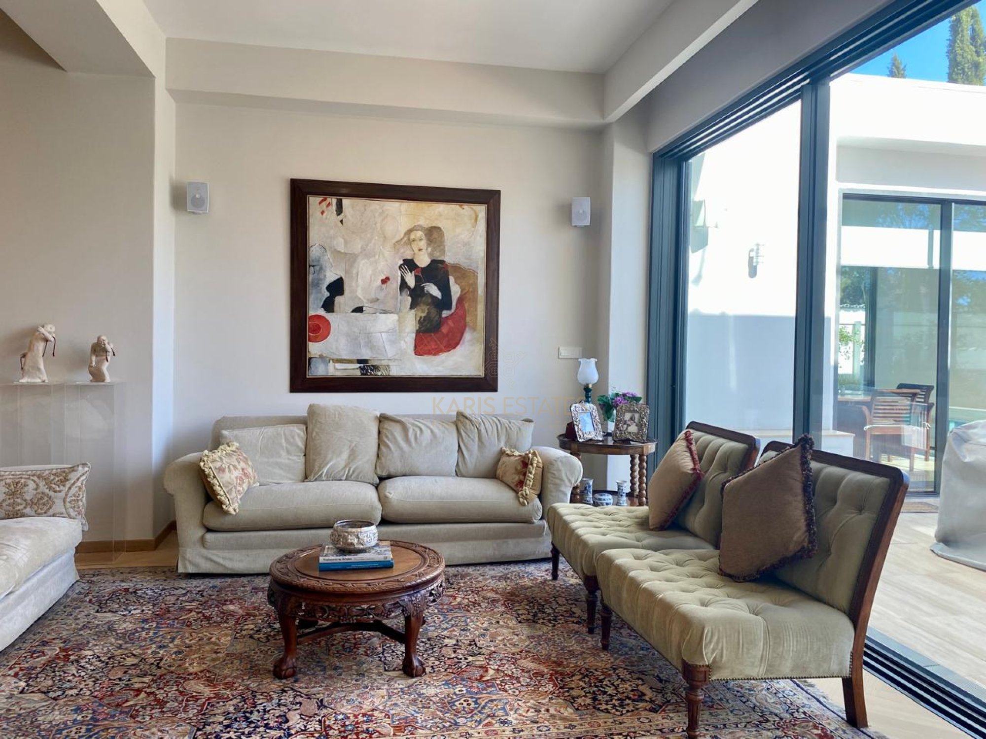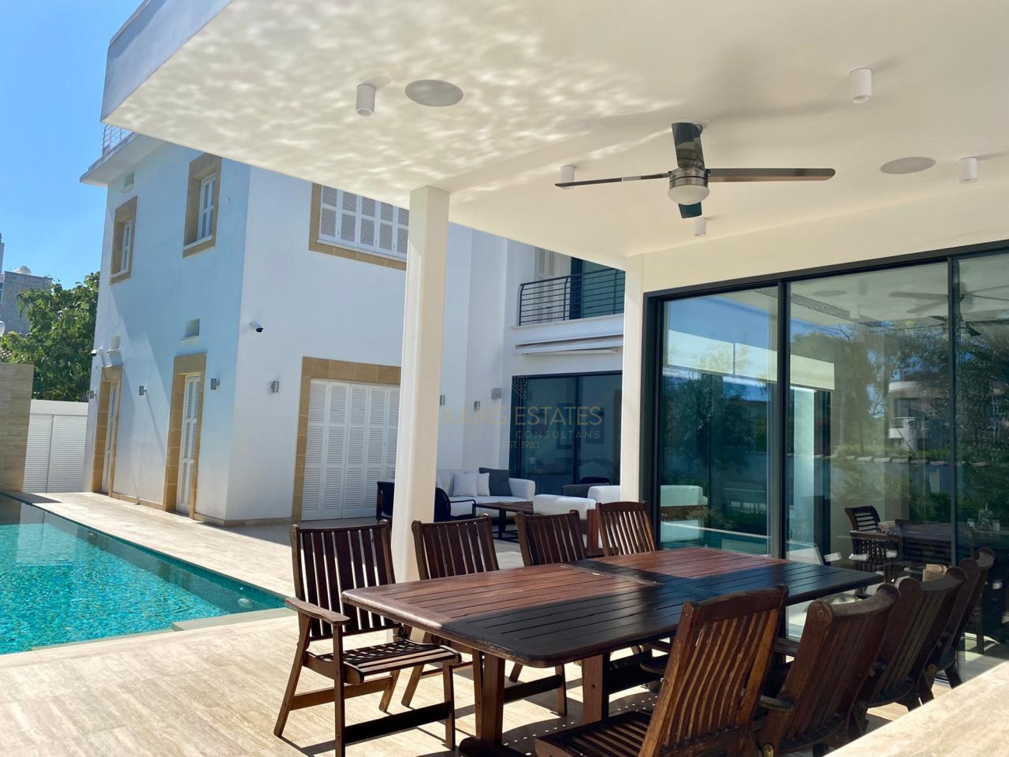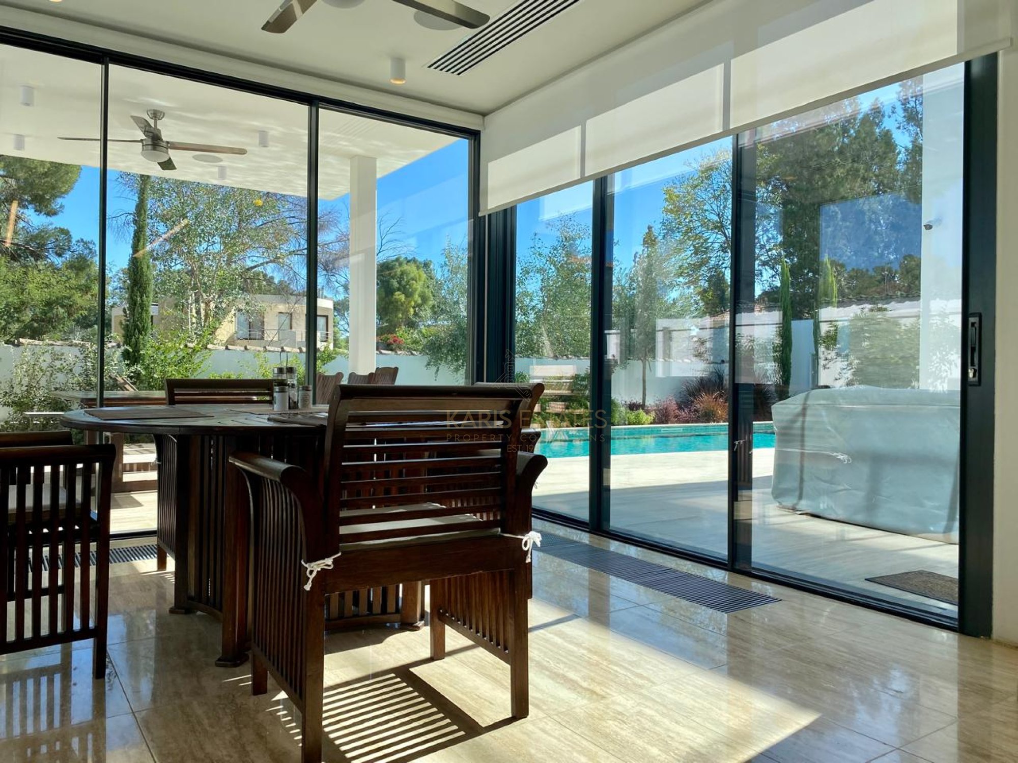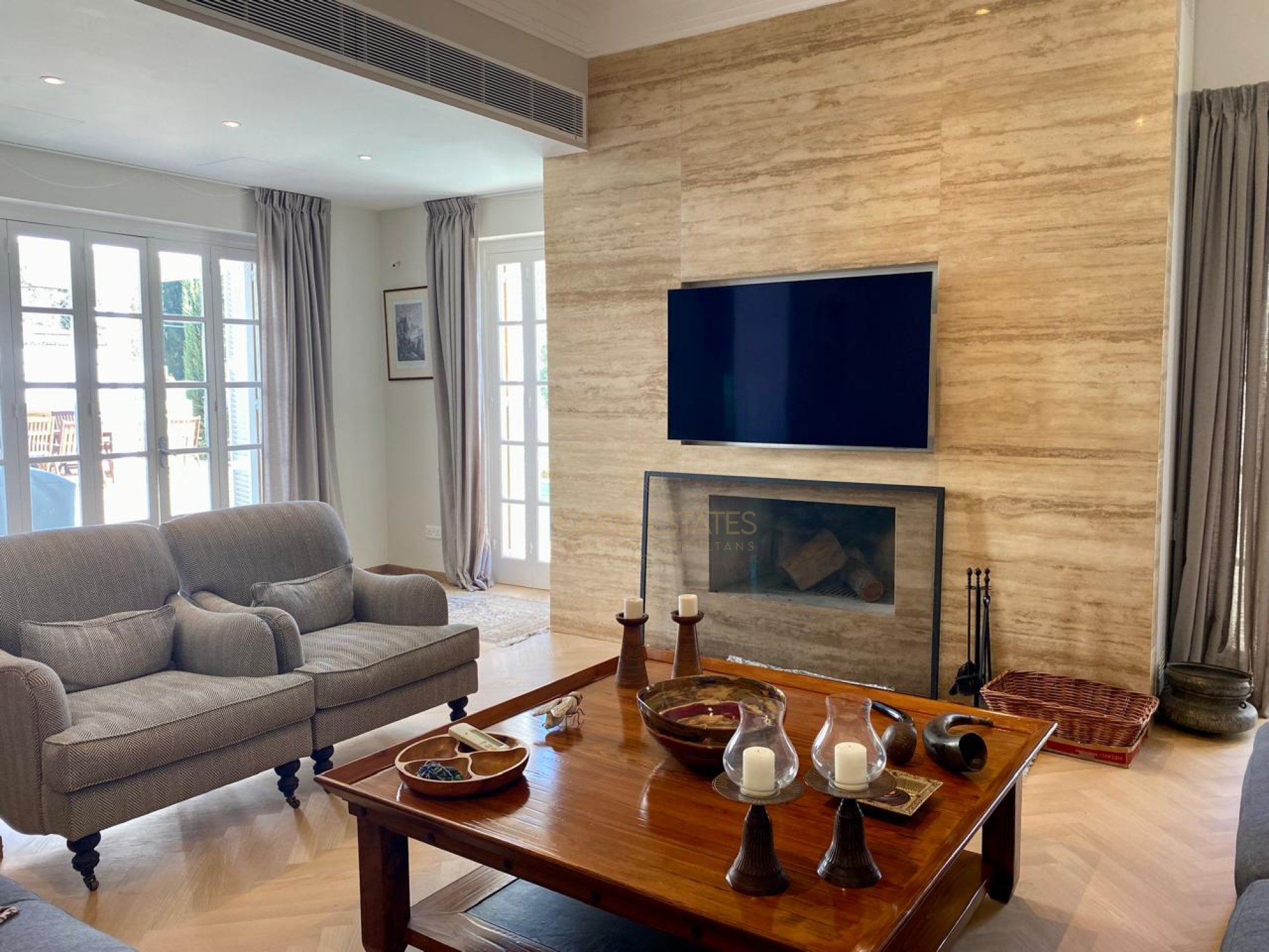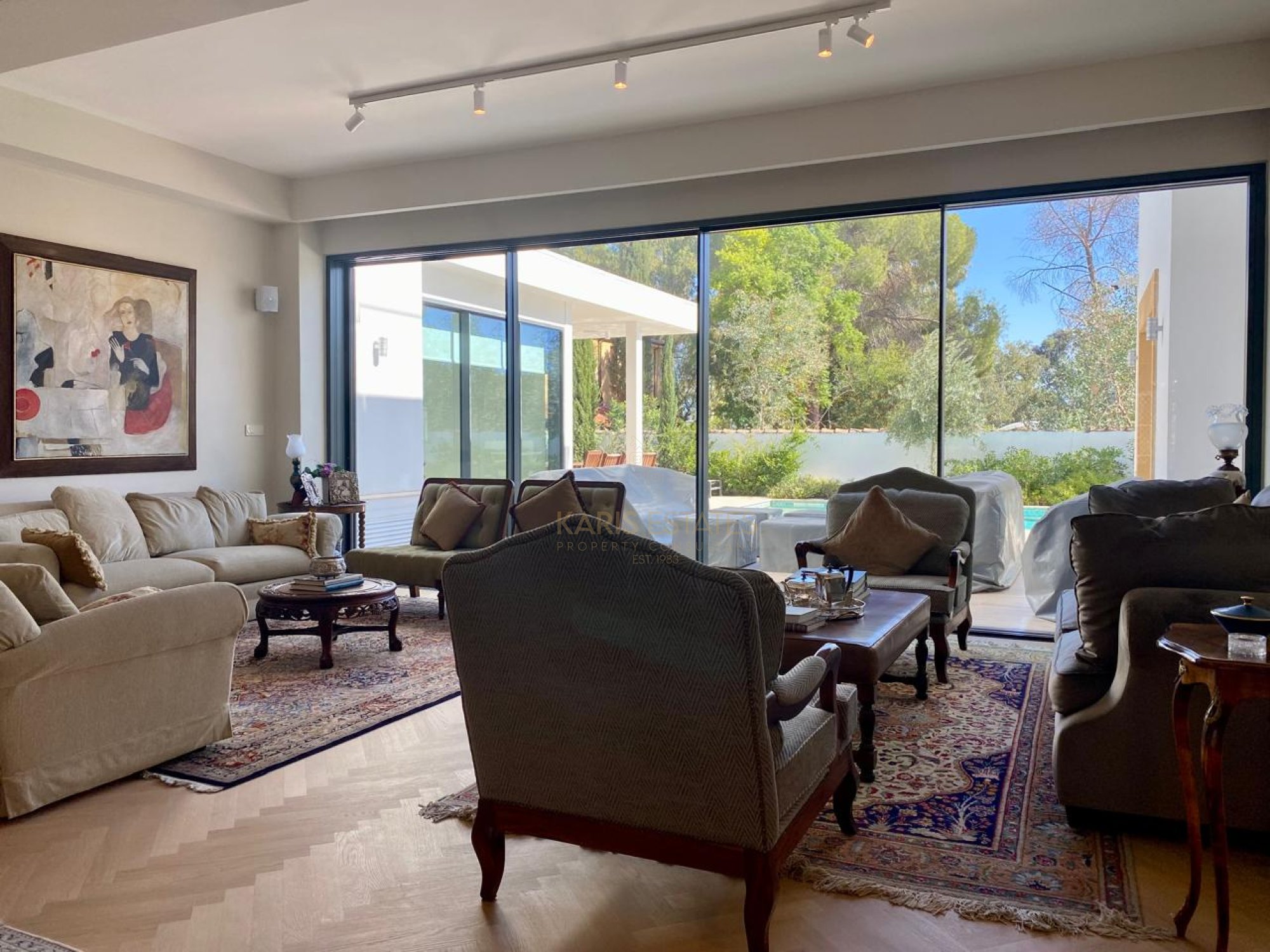 - Main living room overlooking the swimming pool; second living room with fireplace