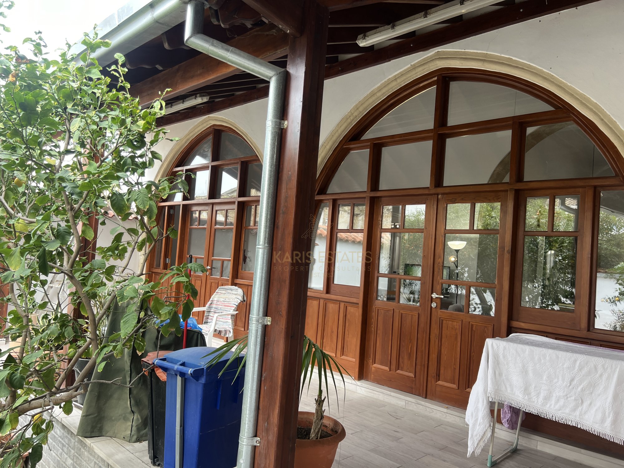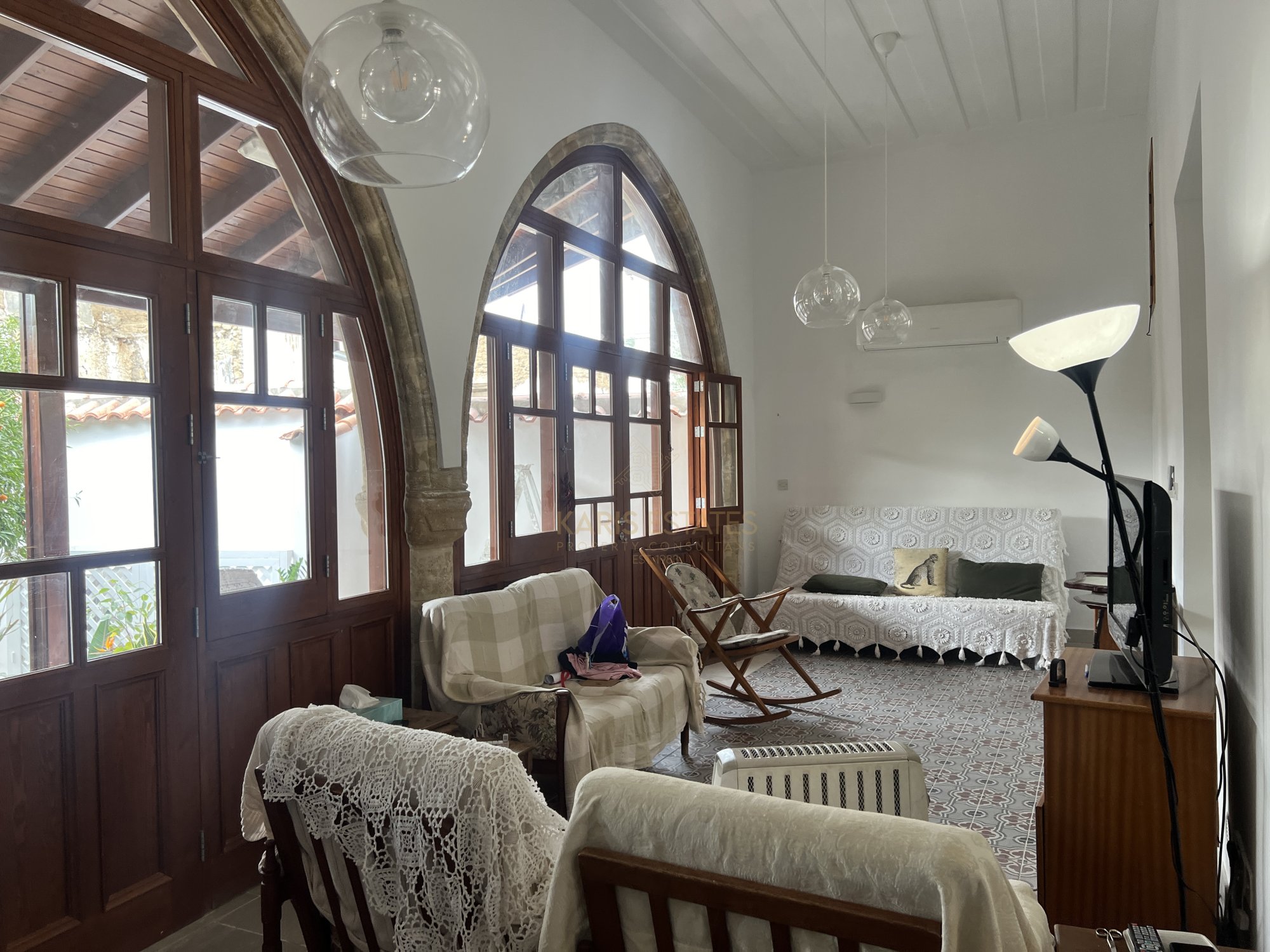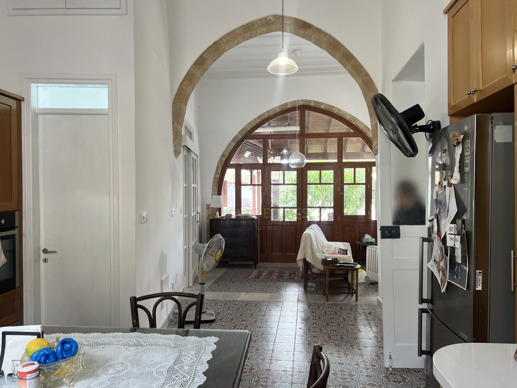 Layout: The home features a classic iliakos (main hall), with a bedroom to the right and an open-plan kitchen, dining, and living area to the left, seamlessly extending to the garden through two large arches